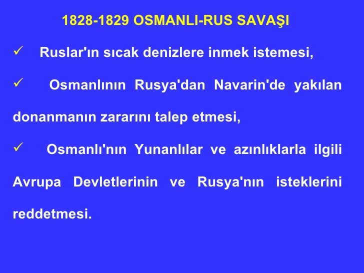 1827 1829 osmanlı rus savaşının nedenleri. Osmanlı devleti nin yanan donanmasına karşılık ingiltere fransa ve rusya dan tazminat istemesi. 1828 1829 osmanlı rus savaşının sebepleri ve sonuçları 1828 1829 osmanlı rus savaşının sebepleri. Savaşın en temel sebebi rusya nın osmanlı devleti ni balkan topraklarından atmak. Rusya 1853 yılından itibaren kavalalı mehmet ali paşa bunalımı sırasında takip ettiği zayıf bir osmanlı devleti üzerinde etki alanı kurma politikasını bırakarak bu devleti yıkma politikası takip etmeye başladı.